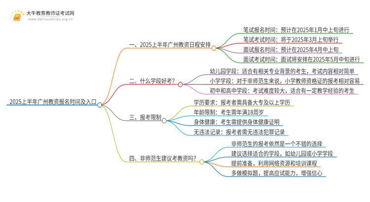 2025上半年广州教资的报名时间和相关安排已经公布,许多同学对此充满期待。本文将详细介绍2025上半年广州教资的日程安排、适合报考的学段、报考限制以及非师范生的报考建议,帮助大家更好地了解这一重要考试。