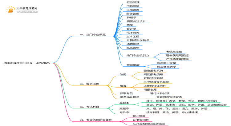 佛山市成考2025专业选择为同学们提供了丰富的机会,涵盖了多个领域的专业。本文将详细介绍佛山市成人高考的热门专业、报名流程、考试科目以及专业选择的重要性,帮助同学们更好地了解2025年的成考专业目录。