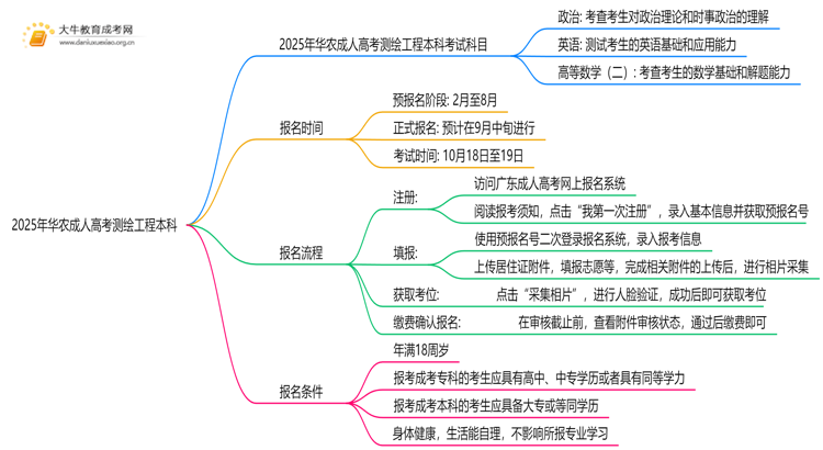 在2025年,华农成人高考测绘工程本科专业的考试科目将包括政治、英语和高等数学(二)。对于准备参加成人高考的同学们来说,了解报名时间、流程以及适合人群是非常重要的。本文将为大家详细介绍相关信息,帮助大家顺利备考。
