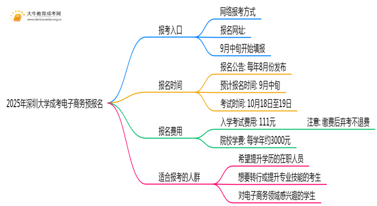 2025年深圳大学成考电子商务(函授)预报名已开启,许多考生开始关注相关的报考信息。本文将为大家详细介绍深圳大学成考电子商务的报考入口、报名时间、费用以及适合报考的人群,帮助考生们更好地准备。