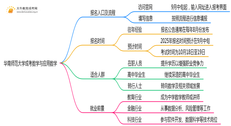 华南师范大学成考数学与应用数学(函授)为广大考生提供了一个良好的学习机会。随着成人高考的临近,了解报名流程、时间以及适合人群和就业前景显得尤为重要。以下是关于华南师范大学成考数学与应用数学的详细信息,希望能帮助到参加成考的同学们。
