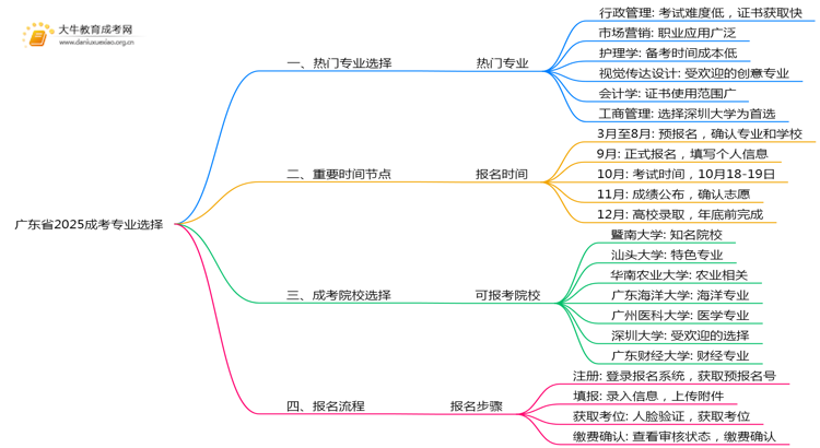 在2025年,广东省成人高考(成考)为希望提升学历的考生提供了多样的专业选择和清晰的报名流程。本文将详细介绍广东省2025年成考的热门专业、报名时间节点、院校选择及报名流程,帮助考生顺利备考。