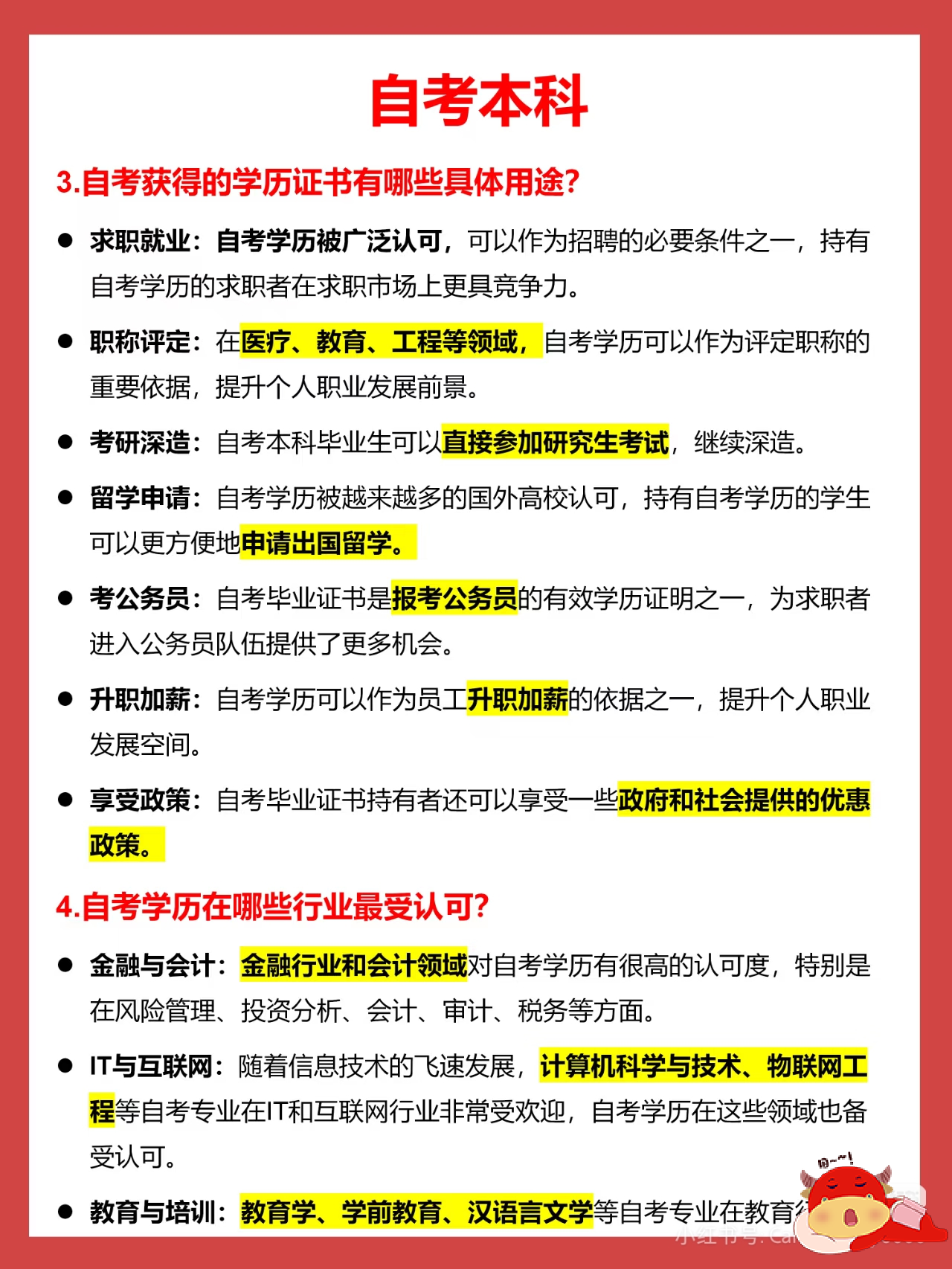 自考本科作为国民教育系列的一种,已经被列入国家招生计划,是国家认可的正规学历。具有教育部电子注册,学信网可查询的特点。自考本科的学历可以用于求职加薪、考公务员、考研究生、考事业编制、考取资格证、评职称等,具有很高的实用性。因此,自考本科的含金量是相当高的,对于需要提升学历的同学来说,是一个值得信赖的途径。
