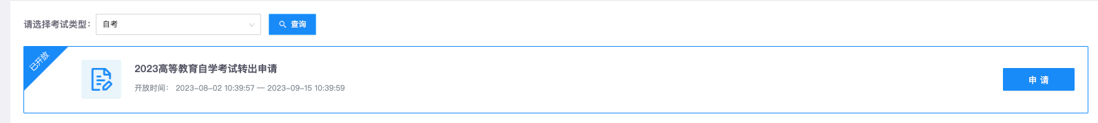 选择申请项目列表中的“2023 高等教育自学考试转出申请”,并点击“申请”按钮。