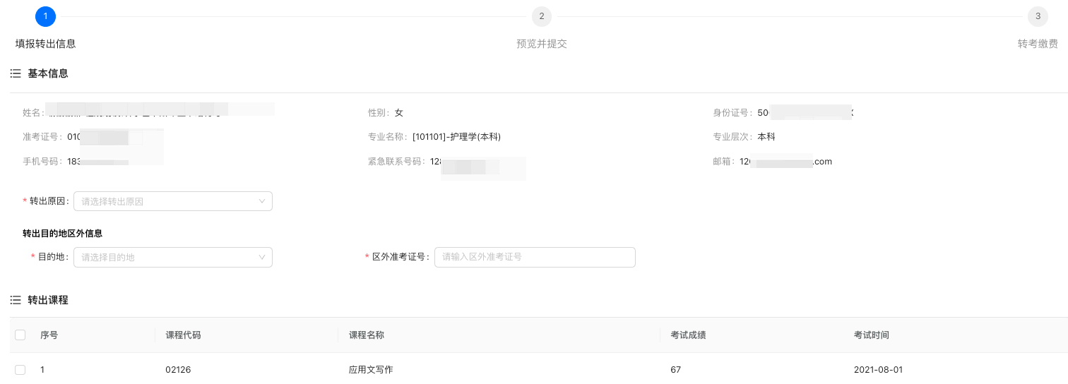 填写转出申请内容,并勾选可转出课程,并点击下一步