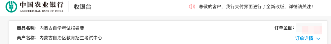 点击确认后,浏览器会打开新页面,农行收银台页面,在此页面可进行转出费用支付。