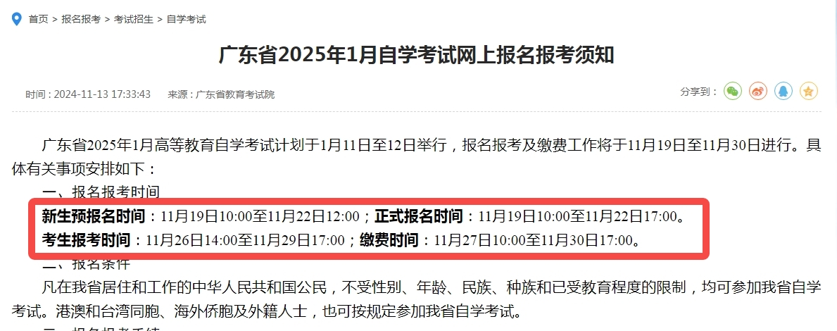 最新公告,广东1月自考报名报考及缴费工作将于11月19-30日进行。如下是具体时间安排: