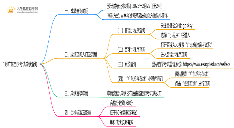 1月广东自学考试的成绩预计将在2025年2月下旬公布,具体时间为2月22日至24日之间。届时,考生可以通过自学考试管理系统查询合格成绩,也可以通过广东省教育考试院的官方微信小程序查询全部考试成绩。建议考生们密切关注广东省教育考试院官方网站,以获取最新的安排信息。