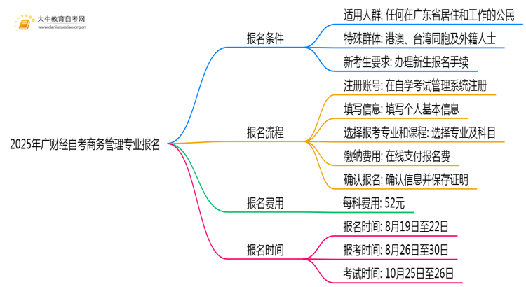 2025年广财经自考商务管理专业的报名费用为每科52元。考生在选择报考科目时,需注意费用的支付。