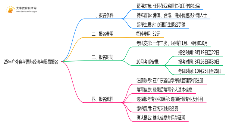 在25年广外自考国际经济与贸易专业的学习旅程中,报名是每位考生必须经历的重要步骤。本文将详细介绍报名条件、费用、时间安排及流程,帮助同学们顺利完成报名。