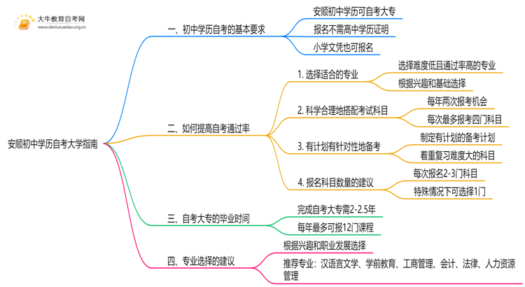 通过以上的介绍,希望安顺初中学历的考生能够对自考有更深入的了解,并能够顺利通过考试,获得理想的学历。如果你对自考还有更多疑问,欢迎咨询大牛教育的老师,他们将为你提供专业的指导和帮助。