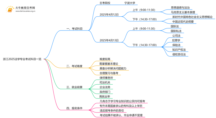 浙江2025法学专业的考试科目主要由宁波大学主考,具体安排如下: