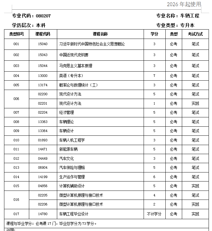 根据规定,2026年广东自考车辆工程本科将以全新科目表开考,未毕业的考生均需按最新课表进行。如下是相关科目表: