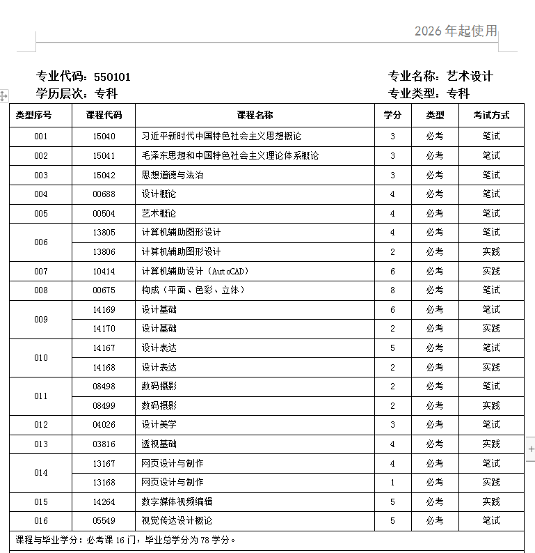 根据最新计划表,2026年广东自考艺术设计专科新课程表如下(请看截图):