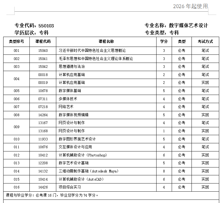广东自考改革将全面启用新计划,任何人选报自考数字媒体艺术设计专科均需按新课表报考。如下是2026广东自考数字媒体艺术设计专科科目表: