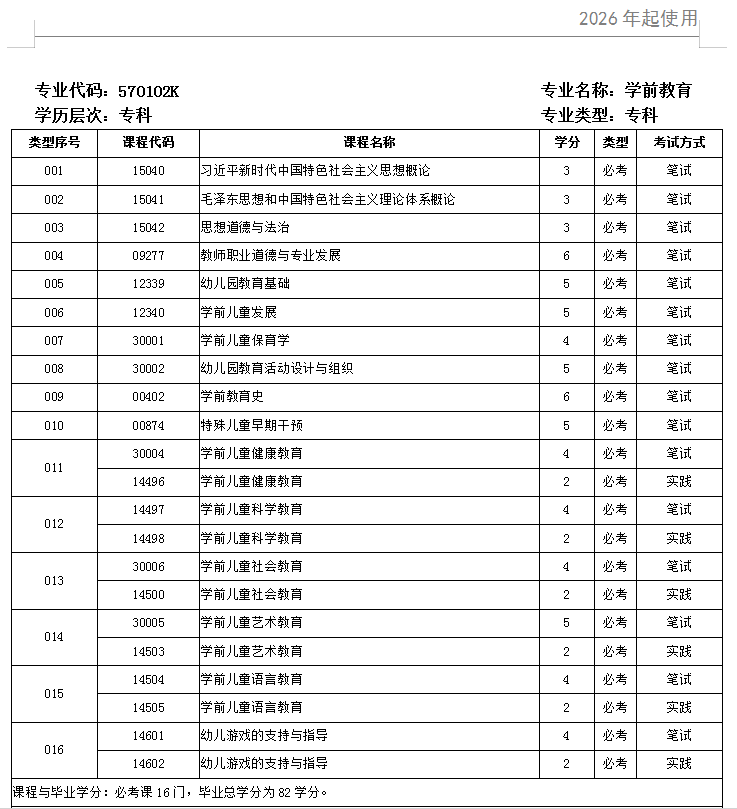 广东自考改革将全面启用新计划,任何人选报自考学前教育专科均需按新课表报考。如下是2026广东自考学前教育专科科目表: