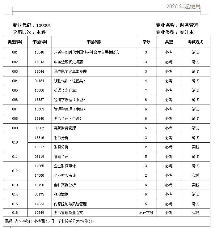 广东自考改革将全面启用新计划,任何人选报自考财务管理本科均需按新课表报考。如下是2026广东自考财务管理本科科目表:
