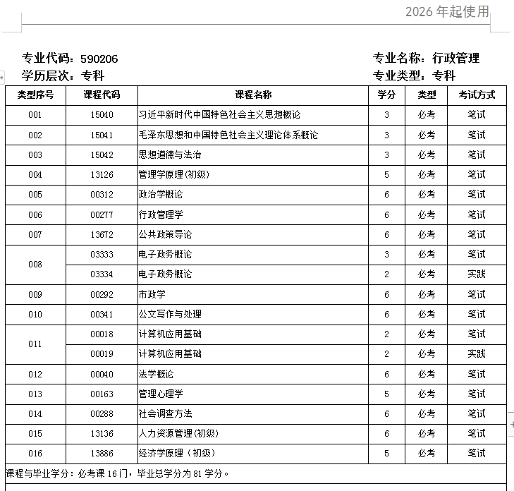 为了让考生更全面了解所要考的课程,以下是2026年行政管理科目一览表: