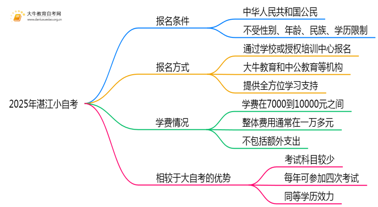 2025年湛江小自考的报名条件相对宽松,几乎没有限制,适合各类考生参与。以下将详细介绍2025年湛江小自考的报名要求、报名方式、学费情况以及相较于大自考的优势。