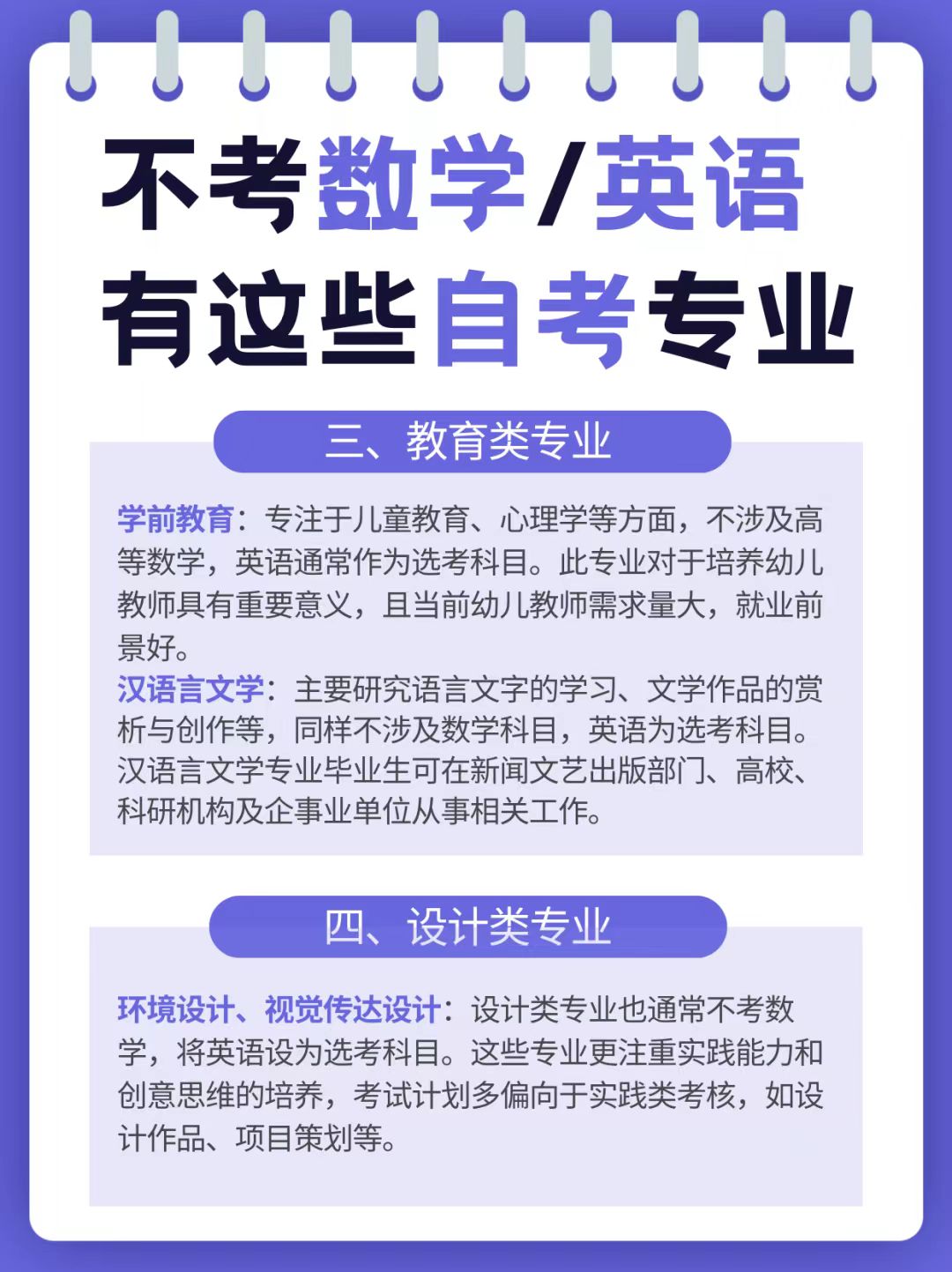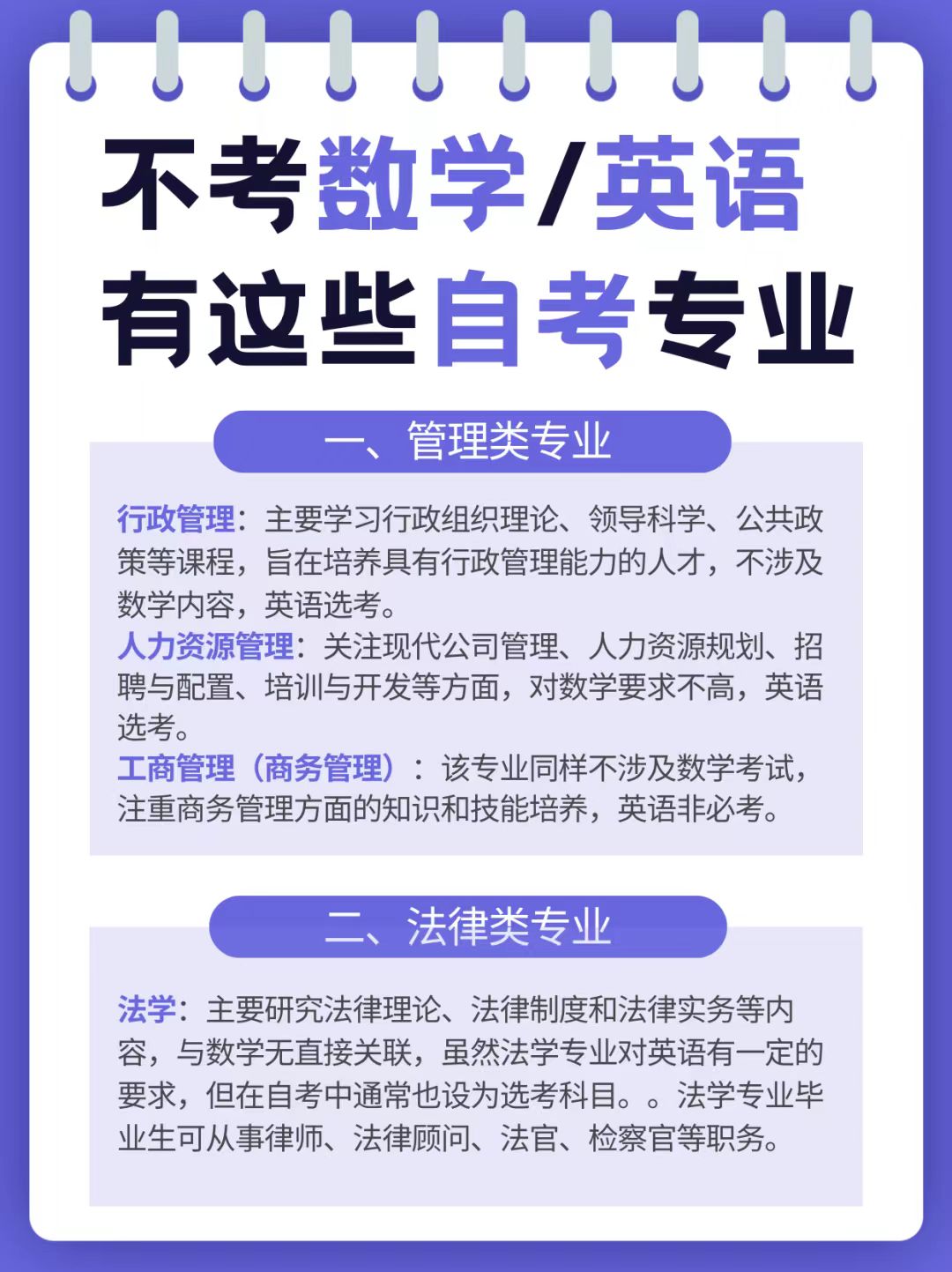 ⑵不考数学专业:在文史类专业中,有法学、小学教育、行政管理等,以及汉语言文学、历史学等。