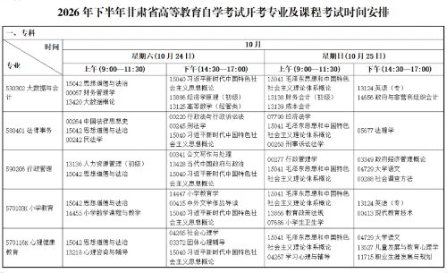 附件:2026年下半年甘肃省高等教育自学考试开考专业及课程考试时间安排