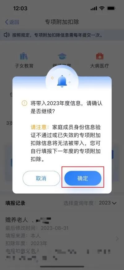 注意事项:扣除年度指可享受专项附加扣除的年度,每次只能选择一个年度。对于子女教育支出、赡养老人支出、房贷利息支出等连续多年的扣除需要每年重新填写或确认。