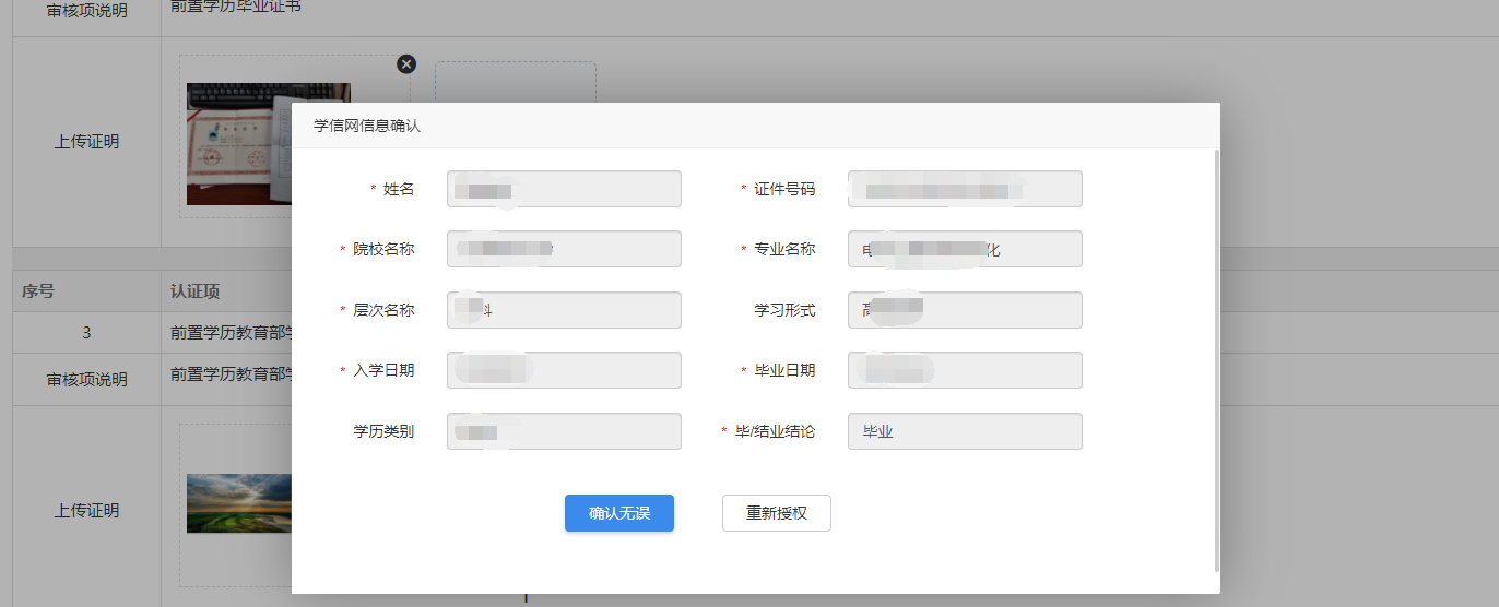 1.如查询到学历信息,系统展示查询到的学历信息,确认无误后,点击“确认无误”按钮。