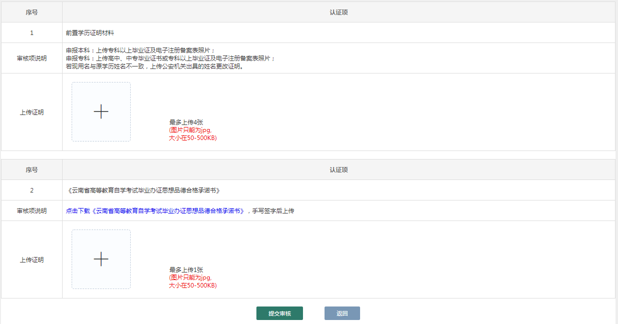 第三步:上传证明材料(每个考生的证明材料不一致,根据自己的实际情况上传证明材料并提交审核即可):