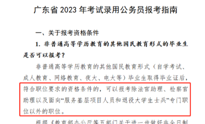 但是有些岗位会有统招限制。例如《广东省2023年考试录用公务员报考指南》就对法官助理、检察官助理以及面向“服务基层项目人员和退役大学生士兵”专门职位以外的职位作了相应的限制,因此建议——同学们报考前还是得到国家公务员局、对应省份的公务员考试网去查看最新的报考指南。